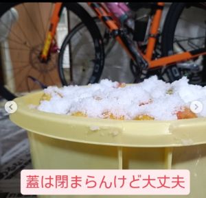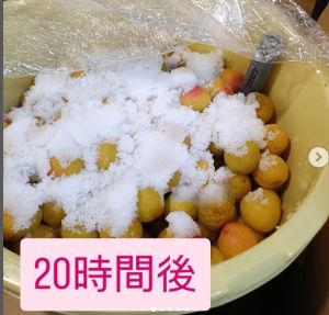 でも、どうせ梅は小さくなり凹みます。蓋が出来なくてもラップで覆っておけば問題ありません。下の写真は、2025年の10kgの梅です。最初は蓋が閉まらず、ラップで覆っています。20時間後には梅が沈んだので蓋をします。