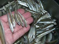 【時間】10時半〜15時半【天気】晴ときどき曇り。朝の気温5度。日中は10度 【エサ】現地購入の紅さし(1パック150円を3個) 【釣果】現地にて計量 1520g(1匹6g換算で250匹) 【記事】 なんで起きられないのかしら。いまだ正月ボケが直らない私。今日も思いっきり寝坊してお金を拾っている夢(500円玉と100円玉だったけど)にはっと起きると6時40分。海釣りにも間にあわない、かと言ってワカサギも微妙な時間。でもまぁ、ワカサギも久しぶりだし行ってみる。朝が遅いとは言えバイクで走るのは寒い。30分でほんの少し寒くなり、1時間で足先が冷たくなる。どんなに防寒してもバイクってのは限界あるねぇ。 まぁ、最近導入したゴアウインドストッパーのウェアーはバイク走行にはかなり有効だね。今日は下着込みで3枚しか着てないもの。まぁ今日は暖かかったしね。が、9時頃に通過した牛久の辺りはまだ田んぼには氷が、、凍結してないだろうなぁ、とちとヒヤヒヤ。凍結もなく、現地着10時、コーヒー飲んでダラダラと準備して糸を垂らしたのが10時40分。う〜ん、ボッチリポッチリ釣れるがこんなもんかね。見回してもこんなものみたい。これじゃ1時間30〜50匹位?と忍耐力ない私はまたも放浪開始。しばらく来てないと「こんなもの」って程度がわからない。境橋上流まで探索して今度は下流に戻る。加茂橋まで戻るも何処もポッチリポッチリ。で、もう行く場所もなくなり15時過ぎたら当たりもピタリと止まり納竿準備。今日は糸を垂れている時間よりボートを漕いでいる時間の方が長かった。(^^;) まぁ、いい運動になったと言うことで。次回は動かないで耐えるように努力する。 しかし、大きい。写真はお裾分け後の700g(換算120匹)。太さは北海道のワカサギ並だね。これだけ大きいと唐揚よりフライが旨そうだけど面倒なので、一夜干しにする。【覚え書き】走行距離195km(燃費29.2km/L)、高滝湖のこんな状態用の道具、、作ったほうがいいような、、、、今の道具だと1匹づつ、、半置き竿にズラァ〜と掛けるには、、、宿題。竿の弾力に頼るより●●がいいような気もするねぇ。 はっちゃん!明日は仕事の帰りに取りに寄ってね。ビールのつまみにどうぞ。(^。^) |