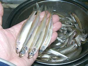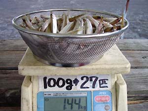 【時間】7時半〜16時【天気】曇りまじりの晴。ワカサギ釣りには暖かすぎる。 【エサ】現地購入の紅さし(1パック150円を2個) 【釣果】私333匹(1.18g) カメさん オクさん、クラさん 【記事】 まだ夏っぽい陽気だけど、行ってきました山中湖。しかし、ボート屋の前はまったく釣れず、 相変わらず動き回る。11時に平野に移動するまで、小女子サイズ2匹と最悪。平野に行ってからは何度かの移動でボチボチ当たり、午後12時半までで260匹。でも、今日はどうもボートが妙な動きをして、2本竿の手前祭り4回で、単純に仕掛けを8組浪費(実際は+α)。なんかうんざり、飽きちゃってと見ていると、クラさんのリールもグシャグシャだし、仕掛けも切れたってので、みさきキャンプ場へボートを寄せる。仕掛けを探してもらいトイレも済ませ、紅富士の湯の前売り券も600円で5枚買ってしばし休憩して再挑戦。なんかね、クラさんは、ボートから落ちてビショビショ。私もなんとなくやる気がそげて、忍耐力がなくなり、相変わらず動き回る。が、カメ&オクさんコンビはじっと同じ場所で耐えてやる気マンマン。(まだ辞めないかね)(あああ、また釣っているよ、まだ続けるね)こっちはエサもなくてもう無駄話ばかりしながら、ちびっとづつ増やす。キリよく300匹。まだ辞めないのかぁ、、ミイラ化した紅サシを拾い集め、針につけて、333匹でキリ良くこんどこそ終わりたい。。終了!終了!終了!とオク&カメコンビに念を送る。 今日はねぇ、なんか、不完全燃焼でした。ワカサギは大きいのもあるが、小女子サイズも多数。釣上げたワカサギも生暖かいし。やはりワカサギは寒い時だな。で、ボートの帰りは遠くて辛かった(よくよく考えれば、他の3人が携帯電話を持っていたのだから呼べばよかったのよね:持ってない自分はそういう選択肢がないの。ごめんね)。漕ぎながら船酔し、ずっと具合が悪く息切れがしてきた。船着き場についてロープを結ぼうして思いっきり吐く。何度も吐く。昼に食べたおにぎりは全て出た。(-_-;) 自分で漕いでいても酔うとは、なんと情けない。 クラさんから貰った缶コーヒーが効いたな。私に飲み物系をくれるときは、スッパイ系を。あと、 ダイエットもできれば20kg位よろしく。って、減量が必要なのは、私も必要か。。(^^;) (写真左は静山荘より拝借、右は小女子サイズ。もっと小さいのもあった。小さいのはチヂミ風にジャガイモと焼いて食べるとグー) |
