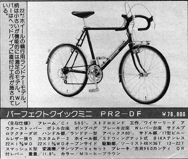 片倉シルクのパーフェクトクイックミニという22inchの小径車でした。下はカタログの写しでノーマル状態のものです。買うことを決めると、購入者をそっちのけでショップの平賀さん、クラブ員の方々が改造談義がはじまり、よくわからないのでそのままお任せすることにしました。それなりの値段なのでかなりアルバイトしましたけどね。