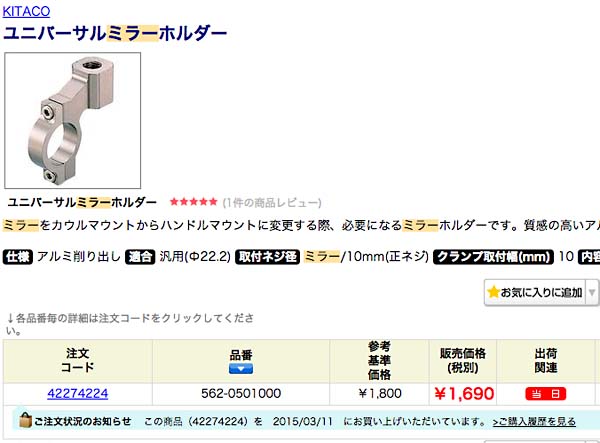 | ミラーは,M10が安心。ホルダーはもっと安価なモノもあります。固定ボルトがチープなだけです。電波時計を付けているのは,2個で480円のミラーホルダーです。自転車用のマウントを買うより遙かに安心で安いです。実はバイクのハンドルと自転車のハンドル直径は同じなんですよね。