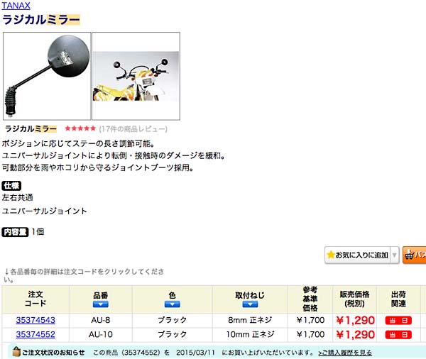 800円程度。 ママチャリハンドルでは,角度調整が非常に難しい。装着は,レバーを取り外す手間が掛かる。ミラーとバンド固定ネジが同じなので,すぐに緩んでしまう。 |