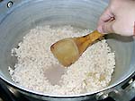 - 浸してある米に砂糖を大さじ1杯、塩小さじ1杯程度を入れて。弱火にかけて、しゃもじで、ざっくりと混ぜなが水分を米に吸わせます。途中で蒸し器を火にかけて待機させておきます。後で固くなってもいいなら砂糖は入れなくてもいいです。