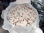 - 米の水分がなくなりなんとなく米が膨らみ半煮っぽくなったら、茹でたささげをざっくりと混ぜます。最初から混ぜると豆が潰れてしまいます。あずき豆を使う場合は、ささげ豆よりも柔らかく潰れ易いので注意してください。待機させておいた蒸し器に水気を絞った蒸し布を広げます。そこに米とささげを移します。蒸し器に蒸気があたっていないと美味しい赤飯にならないのでその場合は、少し待って下さい。その時は別のボールなどに蒸し布を広げそこに米を移します。
