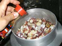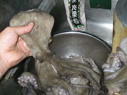 研いだ米に、具を載せて、蛸を載せ、醤油&酒を適量、炊き上げます。炊き上がって蒸らしが終わってからザックリ混ぜます。写真のお釜は、文化鍋愛好家であった私を転向させた釜炊き三昧です。お釜の構造上、炊き込みご飯がキレイに炊けます。周囲からの加熱もあるので具は上に、調味料は上から回しかけるだけで大丈夫です。茹でた蛸を炊き上がりに混ぜる方法もあるようですが、蛸の色がご飯につかないので私は一緒に炊込みするのが好きです。上品に仕上げたいなら、後から混ぜる方がいいのかな。 |