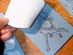 カーボン紙を間に挟み、ボールペンなど先がある程度丸いもので下絵をなぞります。ゴム板の場合は強くなぞる必要があるので先端が尖ったものでやると紙が破けてしまいます。 木版の場合は、尖ったものでなぞっても大丈夫です。木版はさすがにきっちりと線が出ます。木版は塗る面積が大きい場合とかによく使います。 カーボン紙がない場合は裏側を鉛筆でなぞってあるので、やはりゴム板にうつります。消えないように後で版をもう一度ボールペンでなぞっておきます。 |