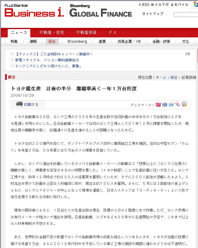 昨年12月に操業開始のトヨタ露工場の生産台数が当初の計画の半分で、原因はロシア人の離職率の高さ(3割退職の結果が生産5割では計算が合わないけど…)とか:FujiSankei Business-iより。 タイムリーに再読したばかりで、あの会社の離職率が高いのは昔から...ま〜日本人と同じ様に耐えると計画してたのかね〜と妙に納得。'72年の潜入ルポは、いまでも生々しい。昔よりは作業も機械化したろうけど、まだまだ過酷なんだろうね。(10月29日) |