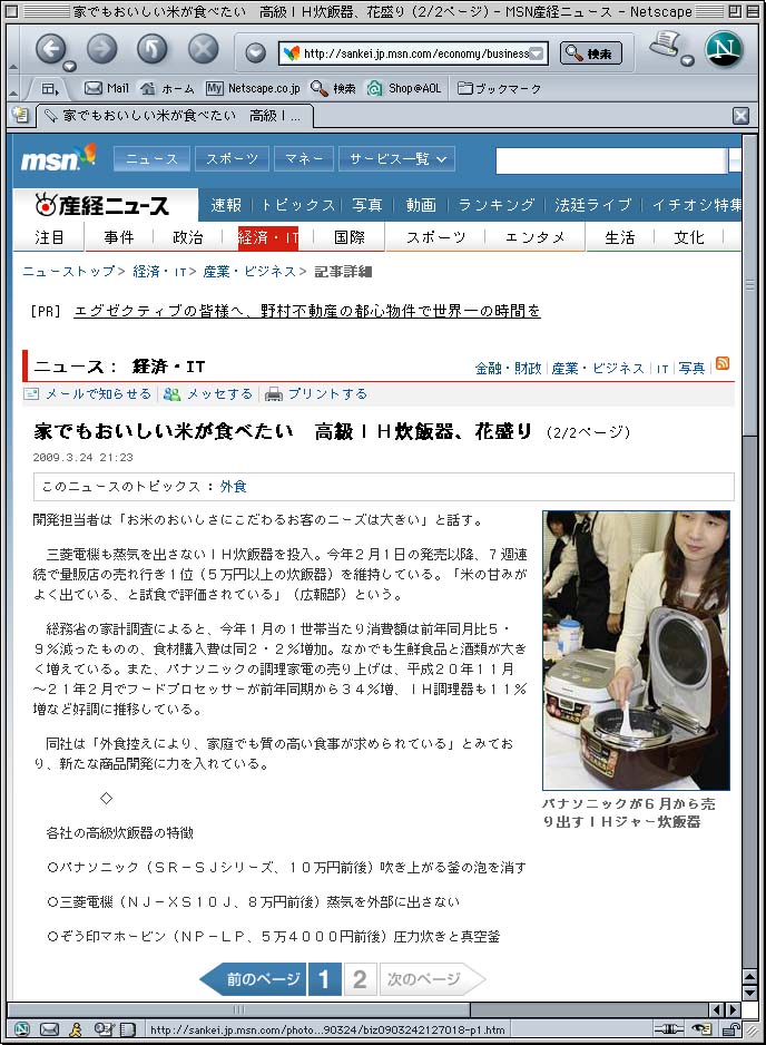 旅行に食事に家電品…週末は折込みチラシ山盛り。外食控えで台所用品の売り出しも目立つ。また高級炊飯器が売れてるらしいね(画像クリック閲覧:2年前にもブーム)。で、お題の「家でもおいしい米」に違和感、私は外食で合格点のご飯粒は、年に一度あるかな(安い店だから?)。友人推薦の洋食屋では久しぶりに激マズのご飯粒に遭遇(炊飯器の不良か?)。だいたいね、外食は「この料理を自分のご飯で食べたい」と思うことばかり。「家でも→家では」の間違いだろうね…高級炊飯器の前にガスで炊いてみたらどうかね。鍋なら劣化せずに買い替えも不要だしね。(4月25日) |
