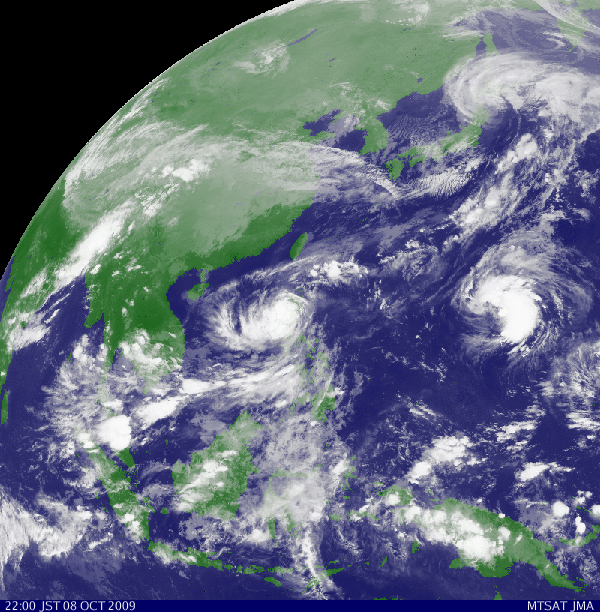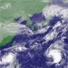 直撃を避けても首都圏の交通は昼すぎまで大混乱。駅の大型モニターには古い家の壁が落ちたり窓が割れた画像、我が家もボロさでは負けないので心配。壁は落ちなくても雨漏りの後片づけは気が重い。ほっとするもつかの間か、19号、20号になりそうな固まりがまた出来ている。まだ<1000hPa>と可愛いが、そのコース上の海水温は高い(分岐点は水温27度)からまだまだ成長する。温暖化の影響で10月の台風コースは毎年これかね。(10月18日) |