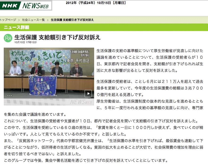 この景気じゃ この報道ではネットで叩かれるでしょ。問題は金額ではないのに誰も気付かぬのか?弁護士とは弱者利用で金儲けする仕事?私は過去18人の生活保護者と住んだが金銭感覚がマトモだったのはたった1人,受給者に必要なのはお金よりも生活指導。あの感覚では足ることは無い,生活保護費は税金,生活補助を与えるなら家計簿提出と使い道のチェックは当たり前は当たり前。役人も政治家も人の金を使うから判らんのね?(10月15日) |