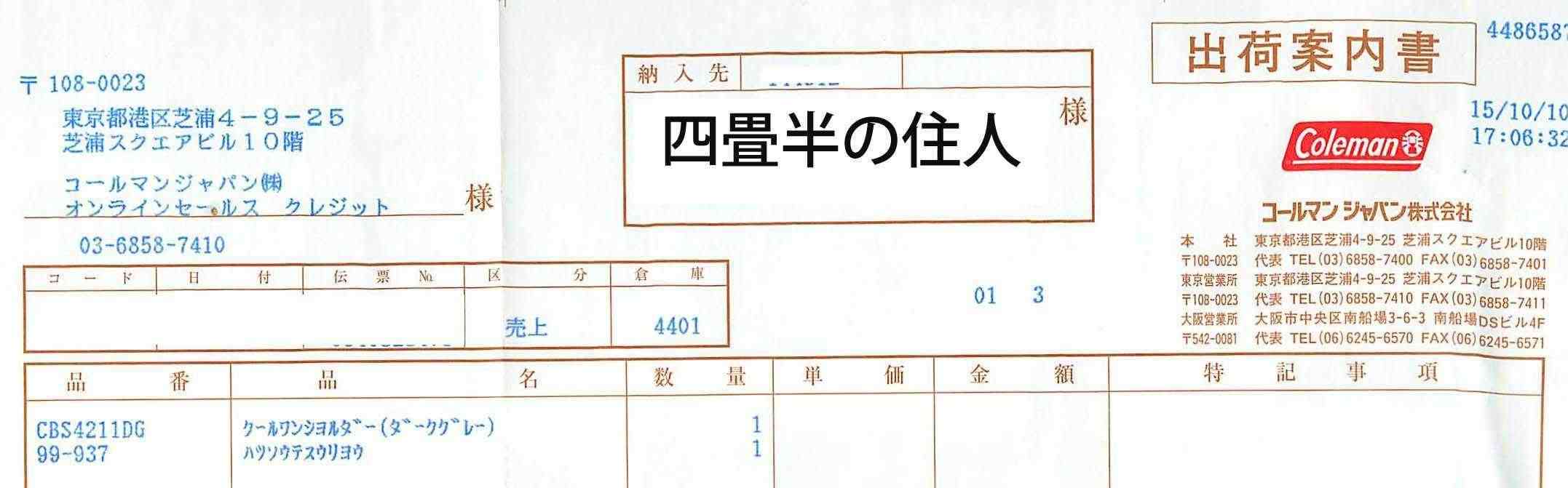 いきなりショルダーザックが届いた。出荷案内書の送り主は Coleman online様,納入先は私。覚えがなくクレジットカードの悪用?とColemanに電話確認。第一声「あ,個人の方ですか…」半日後,別の人間から「●●様よりの注文です」「私共はどのような経緯で送られたのが存じませんし…関与しません」この場合,注文主を入れるのは常識では?(10月28日) |