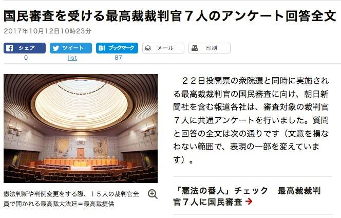 明日は台風直撃だから?期日前投票は大混雑。3回行っても外まで並んでて引き返した。20時ギリギリに行っても30分。国民審査ってズルいよね。本来は,丸印を書かせるべきではないか。さすが日本人の性格をよく研究している。彼らのここ数年の仕事を新聞にでも載せた上で,続けても良いのか判断させるべきだよ。こんなアンケートじゃさ!→ 国民審査を受ける最高裁裁判官7人のアンケート回答全文(10月21日) |