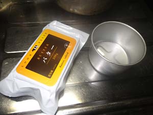 | バター缶が浮かない程度にお湯を注ぐ。 | 溶けて倒れて外にこぼれない様にサポート |