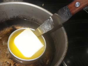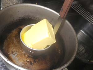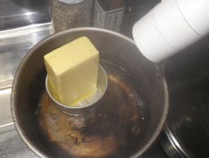 | アルミカップにバターを立てて湯煎にかけます。 バターは40度もあれば溶けます。あまり高温にすると香りが飛ぶので注意。 アルミは熱伝導率が高く,みるみる溶けます。 |