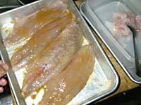 鱗を丁寧に取って、三枚におろす。腹身の部分はそぎ切りして取り除き、皮を剥く。皮は指を皮と身の間に入れてしごくようにすると簡単。私は魚の皮を剥くのに、包丁はほとんど使いません。昆布締めにするのと同じ状態にする。小骨でも気になる人は、ここで骨抜きで丁寧に小骨を取り除いておく。私は平気な人なので、このままです。 | |