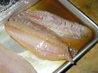 半日置くとこれだけ水が出てきます。この砂糖水は勿体無いけど捨てちゃいます。イシモチの身は、透明でプリプリと固くなっています。せっかく水分が抜けたので、水で洗わずに、表面をキッチンペーパーを押さえて拭き取ります。 | |