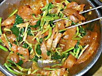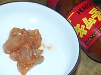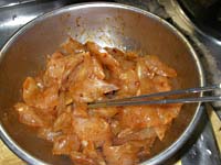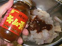 食べやすい大きさにそぎ切り、そして、キムチのタレを追加。白菜のキムチ漬けでもいいですが、水分が少ないキムチを選んでください。白菜はよく刻んでください。また半日置くと食べ頃です。コチジャン、豆板醤など自由にトッピングして韓国風に味付けします。砂糖の甘みは感じなくなります。 | |