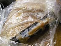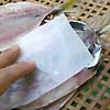 解凍するとすごい量になってしまってねぇ〜〜。じゃ、面倒で使って貰えません。キッチリと下処理した魚は、少量づつラップに包んでさらに冷凍保存用の袋で冷凍します。しかも、市販品のようにキレイに並べて下さいねぇ。省スペースにも繋がりますし、少量づつならば、急な来客、お弁当やあと1品と言う時にも喜ばれるはずです。
