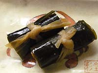 作るのに時間が掛かる物は作ったときに冷凍しておいて少しづつ楽しみます。カンピョウや干し椎茸を煮たら残りは冷凍して混ぜご飯の時に使えます。干し椎茸は、1枚づつ分離できるように並べて冷凍すると使い勝手が良いです。干し椎茸は煮汁をたっぷりと含ませた状態にすると何かと便利です。お弁当にもそのまま乗せれば食べる時にはいい感じ。昆布巻きもそうですねぇ。1本づつラップに包んで冷凍し、食べたい時に皿に出しておくだけで美味しく食べられます。下の写真はお正月に毎年作る昆布巻き(中身は鮭だったり穴子だったり身欠き鰊だったり)で、1年近くも美味しく頂けます。でね、美味しいの。(^0^)