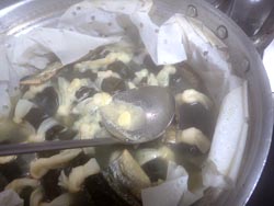 - 鍋に2段になる場合は,上に味見用の今ひとつな見栄えの昆布巻を置くのがコツ。ほどけてきたのも味見用。