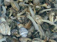 | 3月18日 晴のち曇 | タケさん カメさん 私の3名 10:30-12:00 久津間海岸 | 私のサイトを見てメールをくれたカメさんが意外なほどご近所だったので、潮干狩りにお誘いする。子供の頃やっただけでほぼ初体験とか。タケさんも加わり3名で初潮干狩。本当は明日の予定だったが天気が悪そうなので、急遽変更して土曜日に。しかし、ザクザクと掘れますね。ハマグリばかりで私は閉口したがハマグリ好きもいるらしく、私が捨ててるそばから拾っている人もいたり、、(^^;) 今日はたくさん掘ろうと最初から2名分を買って入場。2時間で粒よりアサリ4kgを集めて撤収。タケさん3kg、カメさんどんなに選別しても5kg以下に出来ず大量にお持ち帰り。この時期は水温もそう温かくないので、貝も元気なままで帰宅するので、暗くすると元気いっぱい。 |
