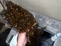 | 5月28日 土砂降りのち曇り | 友達大勢 08:00-10:30 久津間海岸 | 今日は会社の潮干狩。相変わらず大勢で申込んで参加。しかし朝は土砂降りで、雨天決行だが大丈夫かなぁ、、なんて思いつつ現地へ。昨晩の南風の強風でワカメが根っこのまま転がっている。帰りに1本拾って帰る。曇りで天気が悪かったのでワカメの状態も貝の状態もすこぶるよかった。今日も4kgを厳選してお持ち帰り。思うけど、木更津海岸より久津間海岸のアサリの方が美味しい。なんでだろ。 |