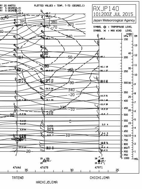 高層断面図(風・気温・露点等)東経130度/140度解析