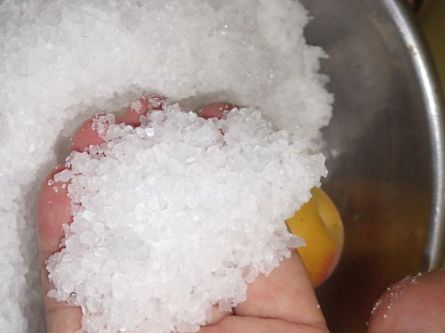漬け込む前に梅の重さを測り,塩を測る 洗った後の梅は,10.4kgありました。3L 10.4kg 371個。今回は,農園で使っている原塩を使います。同じように出来ますように! いつもはテキトーな塩ですので,楽しみです。 こちらの塩は,和歌山の農家さんが使っているのと同じかな。結晶が大きいです。これだと梅に付きにくいから,水分を残すのかな。 |