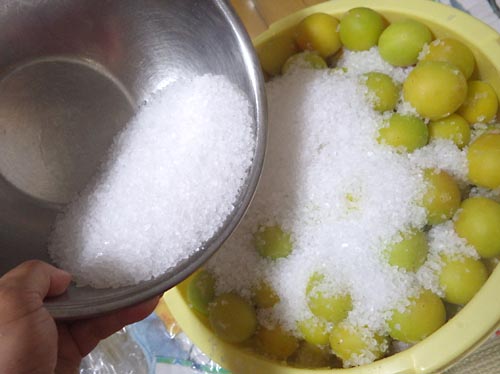 案の定。。でもま,重石無くてやってみるので,このまま盛り上げる。 で,6割の塩をザラザラと載せるのね。なんか調子狂うなーーー まんべんなく振りかけると,溢れるので,真ん中に盛り塩。いいの,,梅酢が出ればいいんだし,出そうな顔しているから平気。 |