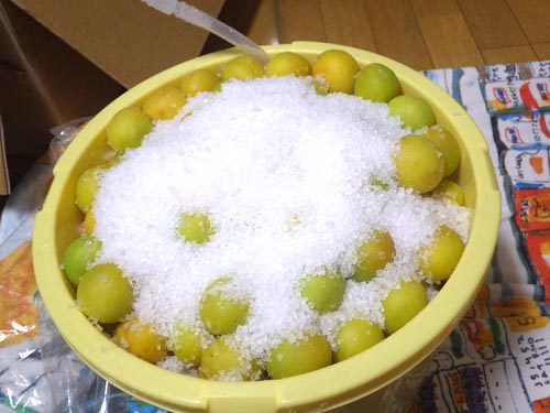 | 黄色いのから下に,,とか言いつつ,つい適当になってしまう私。 それより,ヘソ部が下よ。ヘソ部に塩を擦り込んで下向きに置く。 少ししか漬けないから出来るこの手間。大量漬けなら,小梅と同じく,ドバーですよ!効果あるかないかは不明。 |