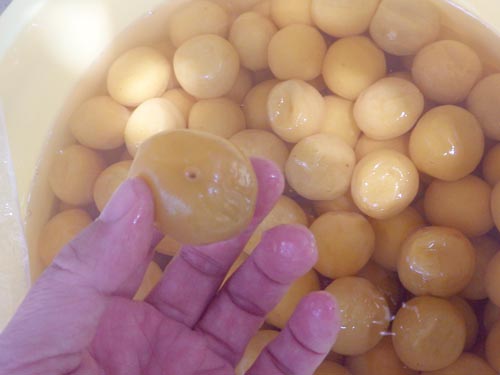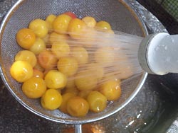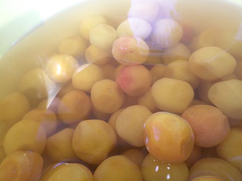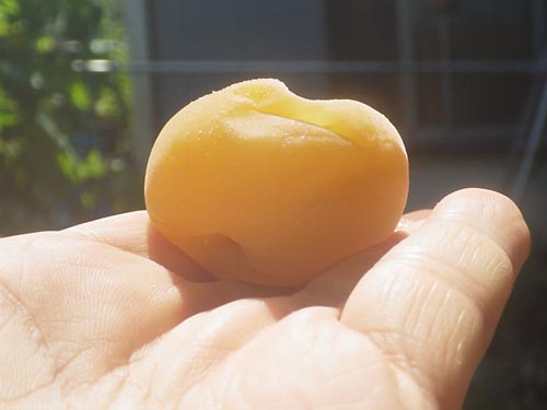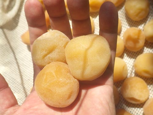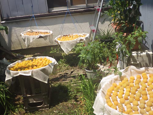 7月11日 第一回土用干(まだ赤紫蘇未投入) 七折小梅や会社の梅を干した後,まだ時間あるなーーってんで,十郎梅を干し始めたのが,午前10時。赤紫蘇を入れるついでなので,干し時間はどうでもよい。今年,揉み紫蘇を買ったらすんごく良かったので来年から全部を白干し,後から赤紫蘇を入れる方式に変えようと思う。その方が圧倒的に楽。紫蘇の香りも残るしね。 |