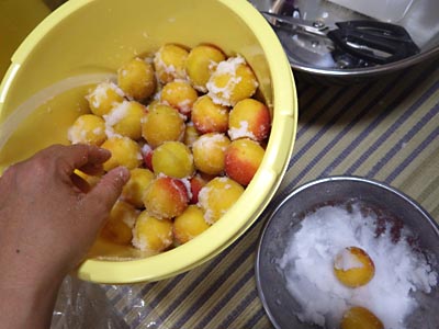 落ち梅 3.3kg それぞれを測ってみると,落ち梅3.3kg,木から採った梅7.4kgでした。森農園の梅は洗ってあるので塩を測ってバケツに放り込むだけで完了です。まずは,落ち梅から作業。 |