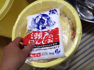 重石は,塩1袋でいいかな。様子を観て追加しても良いし。 本当に塩をまぶすだけなので,ちんたら作業でも25分で終了。 |