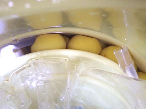 森農園 落ち梅3.3kg 3日半すぎた状態 漬込み後,蓋の位置が下がり始めるので梅酢が出てきたのは判ります。こちらの梅は何の心配もないので,気にすることはないけど,梅酢がいい感じに出るまで約2日,写真は28日の朝の状態。梅酢はこれぐらいの量が出ればヨシ。 |