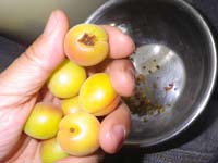 昨年の完熟梅より余裕あるんで,一日香りを楽しむ。 2013年5月25日(日)夜10時に作業開始,,数がある小梅の効率よく右手左手を動かせばすぐに終わります。 4kgの小梅は,10型樽でこれぐらいの容積。 | |