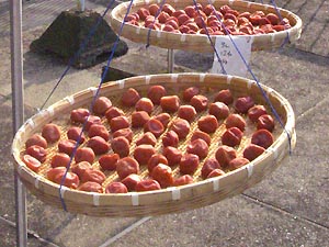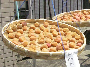 2002年7月 天日干し しかしながら,皮が柔らかく最高の状態で出来上がっている場合は,揺らせば破れる可能性はあります。染まりムラは,梅酢の塩分や紫蘇の色成分がムラになっているからです。どうしても容器の底の方は塩分が濃い→紫蘇の色成分も回りにくいです。梅を動かさずに梅酢が循環出来たら全て解決です。エアチューブを仕込んで漬け込み,エアーを入れる?もしくは,ポンプで吸い上げ循環させる。。などまぁ,色々とあります。